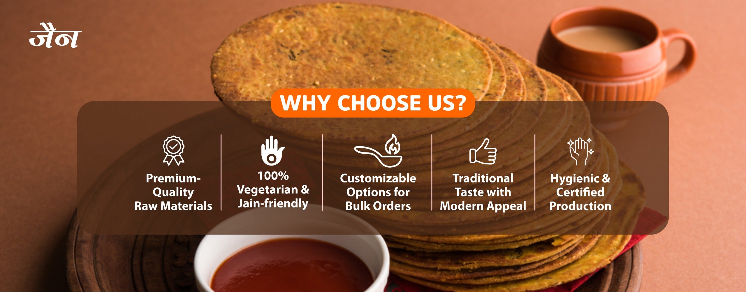 At Jain Food Products, we blend tradition with innovation to bring you a unique range of flavourful and wholesome snacks. We take pride in delivering high-quality, hygienically prepared food products that blend the flavours of tradition with innovative snacking solutions. We use the finest ingredients and modern production techniques to deliver a wide variety of crispy, and flavourful snacks. We have carved a niche in crafting authentic Indian treats that delight customers across age groups. Every product we make reflects our commitment to quality, taste, and purity.