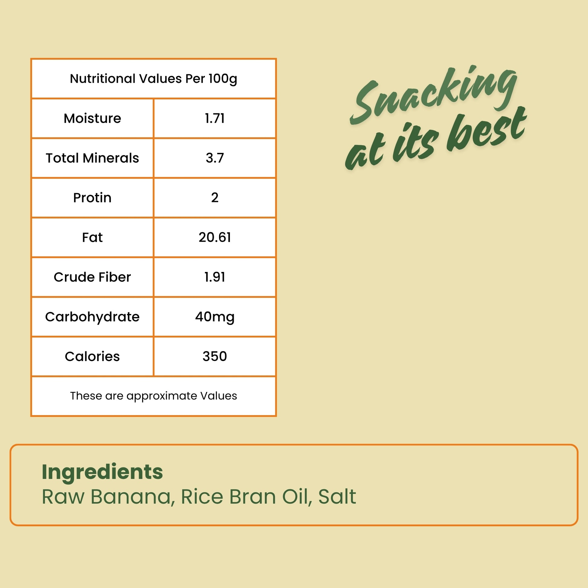 Crafted from carefully selected raw bananas, each wafer is thinly sliced and fried to perfection to bring out its natural flavour and golden crispness. We use minimal seasoning – just the right pinch of salt – to let the authentic banana taste shine through.