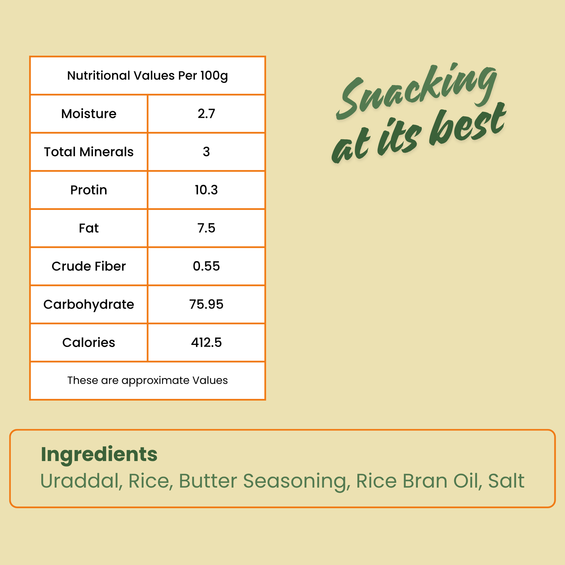 Savour the perfect blend of crispy dosa made with wholesome urad dal and rice, gently roasted with a touch of butter seasoning to bring out rich, buttery goodness in every bite. Lightly salted and roasted with heart-healthy rice bran oil, this snack is a deliciously healthy snacking alternative — no frying, no guilt!