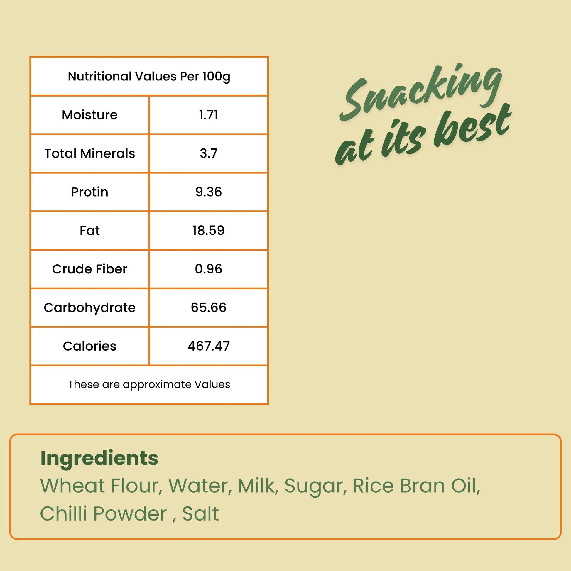 Add some excitement to your sn ack time with our Masala Khakra – a bold and flavourful twist on a traditional favorite. Made with the goodness of wheat flour, milk, rice bran oil, sugar, salt, chilli powder, and water, it’s roasted, not fried, so you get the crunch you love without the guilt.