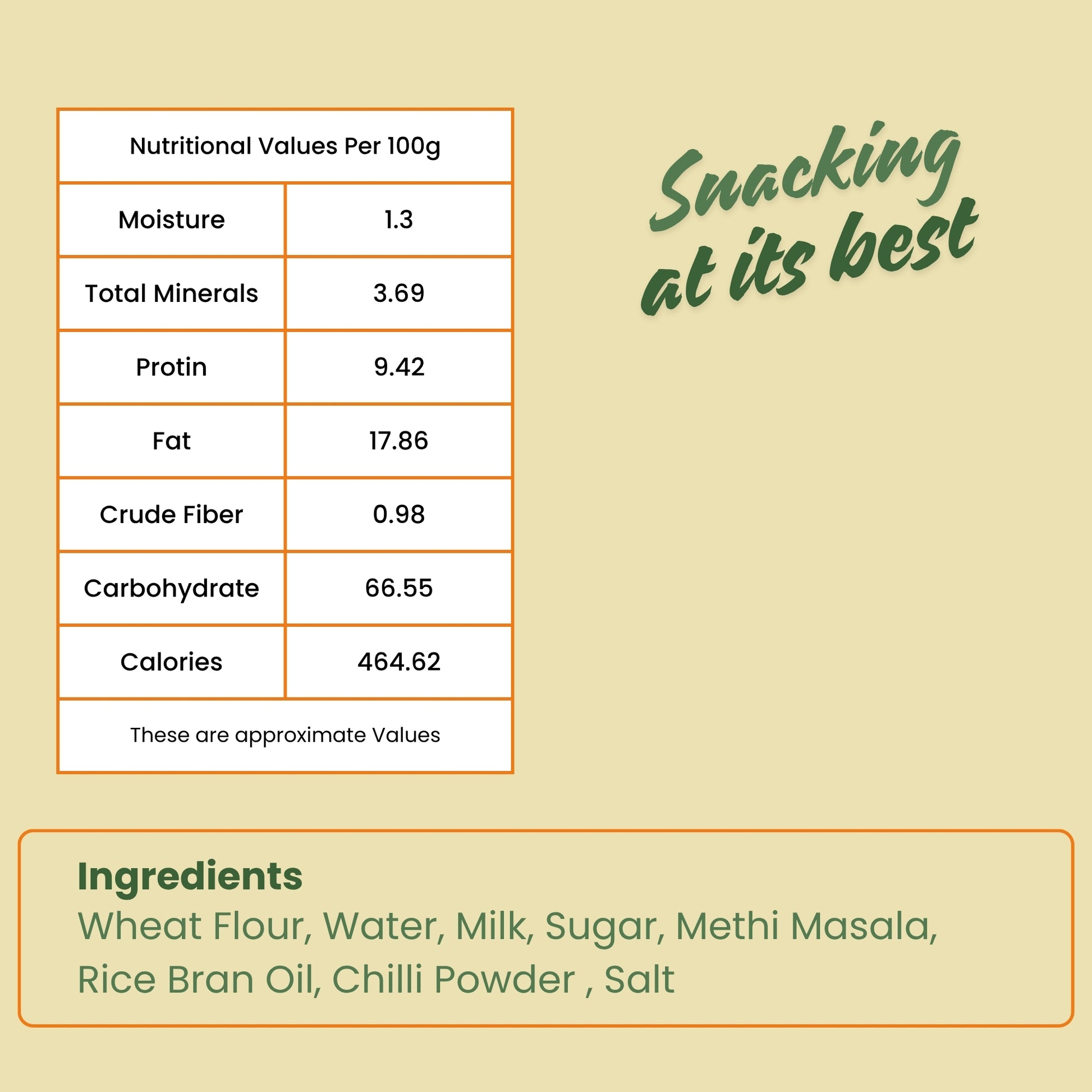 Every bite is a blend of methi’s goodness and mild spices, making it a perfect partner for your chai, travel breaks, or mid-meal munching.