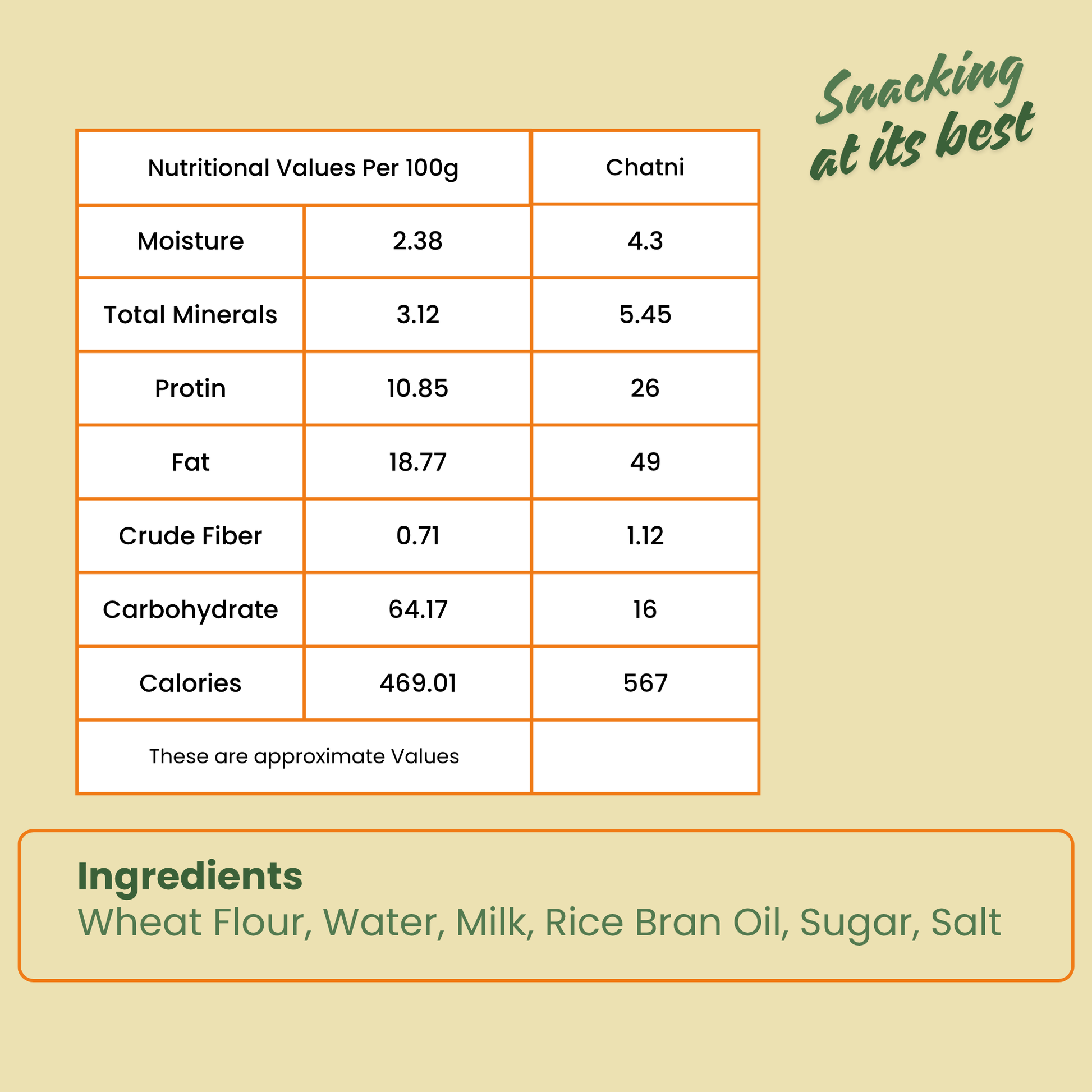 Savor the rich and wholesome flavour of Milk Khakra, made with wheat flour, milk, rice bran oil, sugar, salt, and water. Roasted to a perfect golden crisp — not fried — this khakra brings together nutrition and nostalgia in every bite.