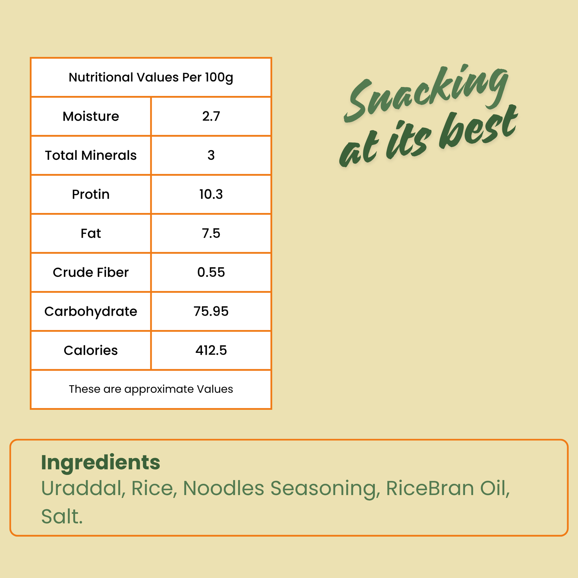 Ever wondered what happens when your favorite noodle flavour meets crispy Dosa? You get the irresistibly delicious Noodles Dosa Khakra! Made with urad dal, rice, noodles seasoning, salt, and rice bran oil, it’s roasted—not fried—for a healthier, guilt-free crunch.